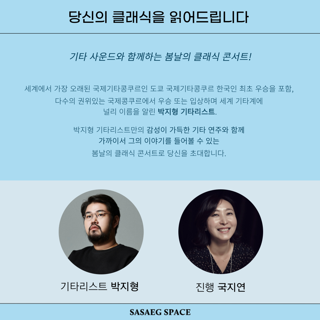 박지형 기타리스트만의 감성이 가득한 기타 연주와 함께 가까이서 그의 이야기를 들어볼 수 있는 봄날의 클래식 콘서트로 당신을 초대합니다.