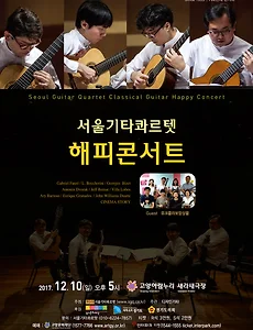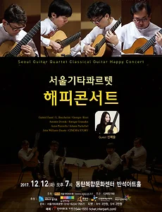 서울기타콰르텟 해피콘서트 일시 : 2017. 12. 10 오후5시 장소 : 고양아람누리 새라새극장 주최 : 서울기타콰르텟(www.sgq.co.kr)주관 : 디자인기타후원 : 한국문화예술위원회, 경기도, 경기도의회, 경기문화재단, 화성시, 화성시문화재단티켓 : R석 30,000원, S석 20,000원예매 : 고양문화재단, 인터파크 티켓문의 : 서울기타콰르텟(010-6224-7857) 서울기타콰르텟은 클래식 기타를 전공한 전문 연주자로 구성된 국내 최초의 기타 4중주단으로서 1999년 7월에 결성한 이래 현재까지 서울과 지방에서 매년 40여회 이상의 공연을 하고 있다. 기타를 위해 작곡된 곡들은 물론 비발디의 사계, 피아졸라의 사계, 영화 음악, 재즈, 가스펠 등 다양한 음악을 편곡하여 연주함으로써 기타로 ..