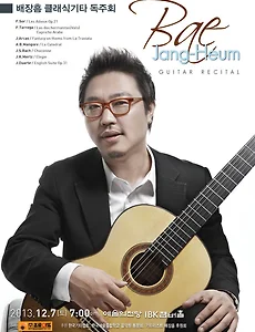 일시 : 213년 12월 7일 (토) 7:00pm장소 : 예술의전당 IBK 챔버홀주 최: (주)프로아트 (www.pro-art.co.kr) 후 원: 한국기타협회,한국예술종합학교 음악원 동문회,기타리스트 배장흠 후원회 회 원 권: R석 5만원, S석 3만원 공연문의: 02)585-2934~6 PROFILE*Guitarist: 배장흠한국을 대표하는 기타리스트 배장흠은 한국예술종합학교에서 기타를 전공, 한국 기타협회 콩쿨과 대전일보 콩쿨에서 금상을 수상하였으며, 10여회의 개인 독주회와 한국예술종합학교 오케스트라, 수원시립교향악단, KT체임버오케스트라, 제주챔버오케스트라, 부산챔버오케스트라, 경북도립오케스트라, 청주시립교향악단, 대구시립교향악단, 강릉시립교향악단, 유라시안필하모닉 오케스트라, 모스틀리 필하모니..