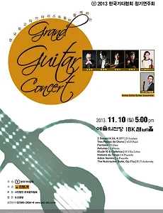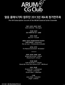 알음 클래식기타 제4회 정기연주회 일시:2013년 11월 9일 토요일 저녁 6시 장소:서울 마포구 카톨릭청년회관 "다리" 5F 니콜라홀(홍대입구역 2번출구) 티켓:전석초대 http://cafe.naver.com/cgclub2 이홍구, 김대근, 윤호진, 허승무 Hotel California - The Eagles 박선영, 최정아 민요 주제에 의한 3장 - 김명표 김대근, 전순영 Duo in G - F.Carulli 정중필, 이상연 (기타동호회 메아리 찬조연주) 낙엽의 콘체르토 - A.Hammond Pres du coeur - P.Senneville & J.Baudlot 김민성, 조민국 Tre Polonesi Concertanti - M.Giulliani Intermission 최정아, 정은재, 전태훈, 신..