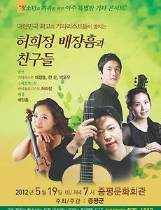 [2012년 5월 19일] 아주 특별한 기타 콘서트 - 허희정,배장흠과 친구들 "청소년과 가족을 위한 아주 특별한 기타 콘서트"대한민국 최고의 기타리스트들이 펼치는허희정,배장흠과 친구들출연:기타리스트 배장흠,한은,박윤우스페셜게스트:바이올리니스트 허희정해설:배장흠 일시:2012년 5월 19일 (토) 저녁7시장소:증평문화회관티켓:무료관람문의:043-835-4113 ProgramAqua y vino,Duo in G,Entertainer,Libertnago,Milonga,Tango,Rumba... 2012. 5. 4.