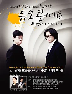 일시 : 2013년 5월 12일(일) 오후 5시장소 : 수성아트피아 무학홀주최, 주관 : 김병현, 최훈락 듀오후원 : 계명대학교 음악대학, 안동대학교 음악대학, 대구예술대학교, 정미션 컨서바토리, 김천예술고등학교, 경북대학교 클래식기타 합주단 토레스 OB회티켓 : 일반 10,000원, 초,중,고 학생 5,000원 (현장 판매 / 문의 010.3484.2907 김병현) L. Boccherini – Introduction and Fandango (Arr. By : J. Bream) Grave assai – Fandango C. M. von Weber – Divertimento for Guitar and Piano Op.38Andante con moto – Walzer – Andante con variazio..