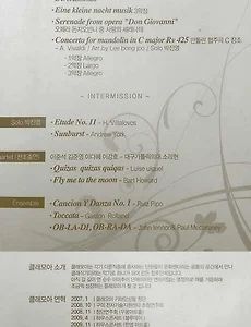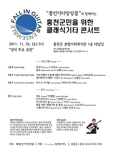 기타연주회730 [2011년 11월 26일] 폴인기타앙승블과 함께하는 홍천군민을 위한 클래식기타 콘서트 폴인기타앙승블과 함께하는 홍천군민을 위한 클래식기타 콘서트 연주 : 폴인기타앙상블 지휘 : 정승원 일시 :2011년 11월 26일 (토) 5시 장소 : 홍천군 종합사회복지관 1층 대강당 (구) 종합문화복지관 홍천군 홍천읍 너브내길 123 (진3리 21-1) 티켓 : 전석 무료 문의 : 홍천군 010-2749-7749 2011. 11. 19. [2011년 11월 22일] 코리아기타오케스트라 코리아기타오케스트라 (구.인천클래식기타아앙상블)제13회 정기연주회 일시 :2011년 11월 22일 (화) 오후 7:00 장소 : 인천종합문화예술회관 소공연장 입장권예매 : 엔티켓 www.enticket.com Tel.032-420-2029 PROGRAM Ensemble(합주) 워싱턴 광장& 진주잡이 Somewhere My Love(닥터지바고 OST) Spanish Coffe...........................................................................Frank Mil The Ludlows(가을의 전설 OST)..................................................James Horner Promise of the wo.. 2011. 11. 19. [2011년 11월 19일] 클랑파르베 Klangfarbe 갤러리콘서트1 상투적인 공연장을 벗어나 새로운 콘서트 무대를 개발하는 성남기타페스티벌의 작은 시도! 갤러리가 주는 고요함과 명상적인 풍경은 음악을 감상하기에는 최적의 장소이다. 이번 콘서트에서는 작품과 매칭되는 명작을 영상으로 관람하면서 관객에게 시각적인 효과를 동시에 선사한다. 르네상스 시대의 작곡가 다울랜드의 노래와 기타를 위한 작품 awake sweet love&Come again으로 애잔한 사 랑을 노래하고 작곡가 서혜선의 플루트와 기타를 위한 "November" 늦가을의 쓸쓸한 정취가 물씬 풍기는 신작이 다. 또한 기타를 위한 작곡에 열의를 보이는 젊은 작곡가 조용진의 소프라노와 기타를 위한 "노을진 자리"는 사 랑에 버림받고 홀로 남은 여인의 슬픔을 노래한다. 존 윌리엄스의 연주로 대중적인 사랑을 받은 Ca.. 2011. 11. 19. [2011년 11월 11일] 4인의기타리스트-사색전 No. 5 다섯 번째 전람회 사.색.전 Four colors Exhibition No.5 다섯 번째 전람회 4인의 기타리스트-김인주,김진수,허원경,박우정 일시 : 2011년 11월 11일 금요일 7시30분 장소 : 고양 어울림누리 별모래극장 티켓 : 전석 20.000원 / 인터파크1544-1555 www.interpark.co.kr 공연문의 : 010-3265-2814 2011. 11. 10. 이전 1 ··· 137 138 139 140 141 142 143 ··· 183 다음