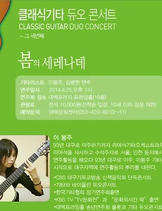 기타뉴스768 [2014년 5월 2일] 2014한국기타연주가협회 추천연주회 2014 한국기타연주가협회 추천연주회 한국기타연주가협회가 2014년 세 명의 클래식기타 영아티스트들을 선정하여 소개하는 추천연주회를 개최합니다. 아직 어린 나이임에도 뛰어난 음악성과 다양한 표현력으로 청중들을 즐겁게 만들어주고 있는 세 명의 연주자들은 앞으로의 활동과 성장이 더욱 기대가 되는 대표적인 차세대 클래식기타 연주자들입니다. 방제석, 이동휘, 원유현 이들이 들려주는 다채로운 음악을 한 무대에서 즐겁게 들을 수 있는 음악회가 될 것 입니다. 일시: 2014년 5월 2일 금요일 저녁 7시 30분 장소: 영산양재홀(서울특별시 서초구 양재1동 20-4) 주관/주최: 한국기타연주가협회 전석 20,000원 10,000원 문의: 영산양재홀 02-571-7689 한국기타연주가협회 010-8910-6942 ww.. 2014. 4. 30. [2014년 4월 25일] 이봉주 김병현 기타듀오 콘서트 봄의 세레나데기타리스트 이봉주,김병현 연주일시:2014년 4월 25일 오후 7시장소:대백프라자 프라임홀(10층)티켓:전석 10,000원(선착순 입장,10세 이하 입장 제한)예약문의: 대백문화센터(053-420-8010~11) 기타뉴스우리동네기타학원 2014. 4. 20. [2014년 4월 25일] 서울기타콰르텟 연주회 그림 그리는 기타 노래하는 모래여인서울기타콰르텟 연주회 일시:2014년 4월 25일(금) 8:00PM장소:아시아출판문화센터 1F 대회의실공연문의:1600-4695(예매퀵서비스) 기타뉴스우리동네기타학원 2014. 4. 20. [2014년 3월 24일] 예술의 전당 콘서트홀 기타리스트 홍상기 프라임 필하노닉 오케스트라 협연 프리모 깐딴떼 제 17회 정기연주회 일시 : 2014년 3월 24일(월) 오후8:00 장소 : 예술의전당콘서트홀 티켓가격 : R석 10만원/ S석 7만원/ A석 5만원/ B석 3만원/ C석 2만원 오케스트라와 함께하는 Primo Cantante 신춘 음악회 ‘희망의 새 시대를 향하여!’ 격동하는 2014년 봄에 우리의 대한민국이 서 있습니다. 급진적인 우경화로 본색을 드러내기 시작한 일본 아베정권으로 인해 시작된 동북아의 불안과 아직 채 가시지 않은 세계경제의 위기 속에서 올 한해에 한 민족의 명운이 달려있다고 해도 과언이 아닐 것입니다. 그러나 우리는 지난 역사 속에서 그 어떤 위기에도 결코 굽히지 않고 당당히 나아왔습니다. 이에 우리는 2014년을 오히려 희망의 새 시대를 열자고 선언합니다. 우리 모.. 2014. 3. 20. 이전 1 ··· 97 98 99 100 101 102 103 ··· 192 다음